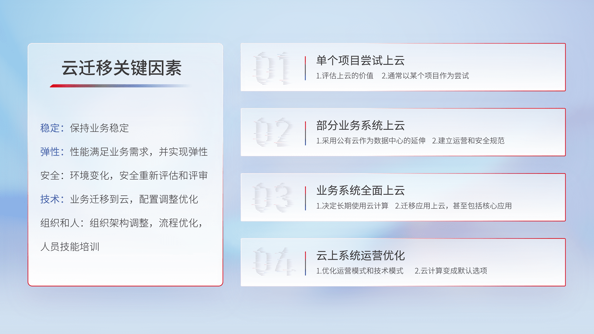 结合实际业务,,,从规划设计、、、云平台选型、、云原生改造、、、数据迁移、、、集成交付,,迁移全过程为客户识别最佳上云路径,,,,做好风险识别管理,,设计网络架构、、、、身份权限、、安全审计合规、、操作审计、、日志审计、、监控告警策略、、、、多站点容灾设计等,,,对云上基础设施进行整体规划,,,,提升IT治理水平,,,以满足弹性、、高可用、、高性能的需求。。。。